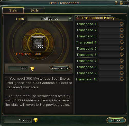 Each Transcendence requires 300 Mysterious Soul Energy, and 500 Goddess’s Tears.