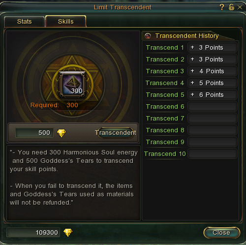 For Skill Transcendence, it will require 300 Harmonious Soul Energy and 500 Goddess’s Tears.